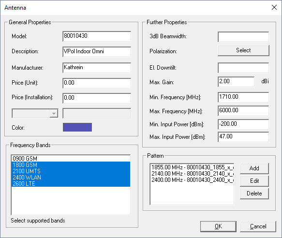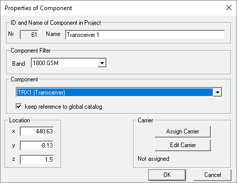 Besides the technical details, each component can be assigned a number of frequency bands. These frequency bands are useful when adding components to network projects, as the list of available components can be limited to a single band, making the list more comprehensible.