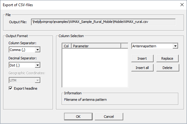 - Defines the interpretation for each column. Selected items can be inserted with the Insert button. An item in the list defines a property of the sites to be exported. Under Information, you can view additional information about the different export options, such as supported formats.