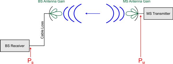 For specification of the Tx power in EIRP or ERP mode, you have to define PE (including cable loss and BS antenna gain). PR1 is the received power including the MS antenna gain.