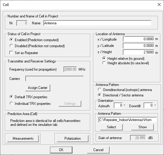 - A selection between isotropic antenna and directional /sector antenna. An antenna pattern must only be defined if the sector antenna is enabled. If omnidirectional antennas should be considered, an isotropic antenna can be selected, and the gain of the omnidirectional antenna can be added to the EIRP value of the output power.