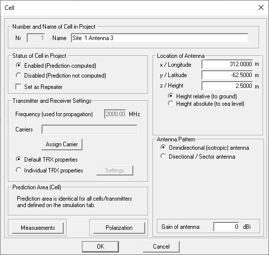 - Select between an isotropic antenna or a directional / sector antenna. An antenna pattern must only be defined if the directional antenna is enabled. If omnidirectional antennas should be considered, an isotropic antenna can be selected, and the gain of the omnidirectional antenna can be added to the EIRP value of the output power.
