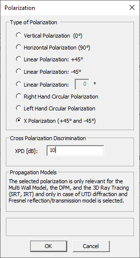 - When using GTD/UTD and Fresnel coefficients for the calculation of diffractions or reflections and transmissions, respectively, arbitrary linear polarizations (between +90° and –90°) or circular polarizations can be considered for the ray-tracing models (SBR, SRT & IRT), the dominant path model and the empirical multi-wall model. The corresponding polarization can be defined for each Tx antenna individually. X-polarization combines +45 and -45 degrees in one antenna for convenience.