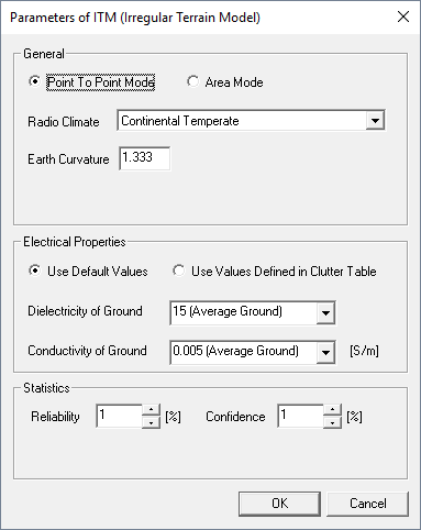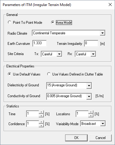 The area mode does not consider the terrain elevation database specified for the simulation project. The area prediction mode estimates the terrain profile using empirical medians. Therefore, some additional parameters have to be defined.
