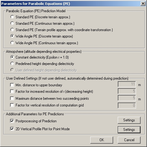 All PE models use a forward iteration algorithm. Therefore, backward orientated effects (such as reflections at the opposite hillside) are not considered. This leads to pessimistic predictions above down-sloping ground. To avoid unrealistic high path loss values, two post-processing modes has been integrated which can be configured by clicking Settings.