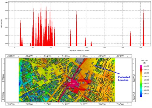 Angular profiles at the base station as well as at the mobile station can be analyzed for each computed pixel within the simulation area.