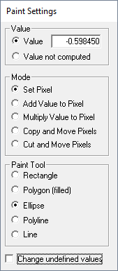 Under Mode, you can change the drawing mode. The specified value can be set directly to the selected pixels, added or multiplied to the actual values of the selected pixels. It is also possible to copy and past the values of selected pixels to other pixels. The Copy and Move Pixels mode copies the values of selected pixels and pastes them to a user-defined location within the result area. Using the Cut and Move Pixels mode instead, cut the values at the original position. The result values at the original location will be set to Value not computed after the paste operation in this case.