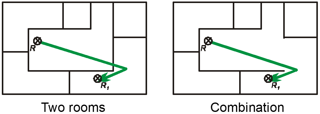 The coordinates of the path are always computed with the same algorithm, independent of the number of transmitted walls and passed rooms. This is only possible by combining all passed rooms to one room for the determination of the path. This is shown in Figure 2 for a given dominant path. Rooms 1 and 5 are combined, erasing wall E (names of the walls and rooms are given in Figure 1). Subsequently, the situation becomes similar to the situation where the receiver and the transmitter are located in the same room. The solution for the determination of the path inside a single room is described in the following section.