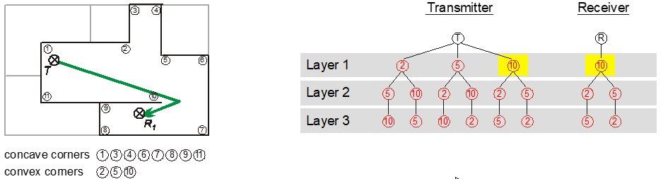 Two trees are necessary, one for the transmitter and one for the receiver. If there is a line of sight between the transmitter (receiver) and a convex corner, this corner is put in the first layer of the tree. The second layer consists of all convex corners which are visible (by a line of sight) from the corners in the first layer.