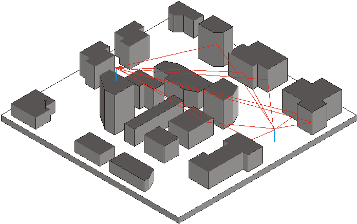 Radio transmission in urban environments is subject to strong multipath propagation (see Figure 1). Dominant characteristics in these scenarios are reflection, diffraction, shadowing by discrete obstacles and wave guiding effects in street canyons. To consider these effects in a propagation model, it is necessary to gain knowledge of all dominant propagation paths. These paths depend primarily on the base station antenna height with respect to the surrounding building heights.