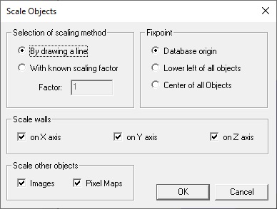 After the user confirms the selection of the options, he can select if he wants to scale the database numerically (by entering a scaling factor) or by definition of a reference distance (drawn with mouse).