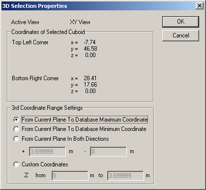 The 3rd coordinate range can be altered in this dialog using the predefined settings From Current Plane To Database Maximum Coordinate or From Current Plane To Database Minimum Coordinate. These selections will calculate the database maximum 3rd coordinate or the database minimum 3rd coordinate, respectively. The calculated coordinate values are entered in the corresponding edit fields underneath the settings From Current Plane In Both Directions and Custom Coordinates. Choosing one of the latter enables the edit fields and custom values can be inserted.