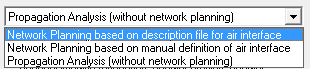 For network planning, the air interface (for example, CDMA, OFDM) are to be defined with parameters related to carriers (number, bandwidth, separation), transmission modes, coding, required signal-to-noise-and-interference ratio at the receiver. This information may be loaded from a file with extension .wst or defined manually.
