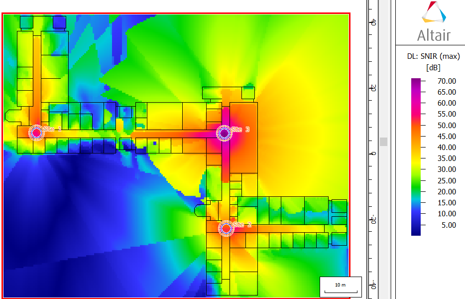 The network-planning simulation adds results like signal-to-noise-and-interference ratio (SNIR), cell assignment, maximum data rate, maximum throughput, coverage probability. At every location in the area of interest, whether one can communicate with a particular air interface and data rate depends on the minimum required received power and minimum required SNIR.