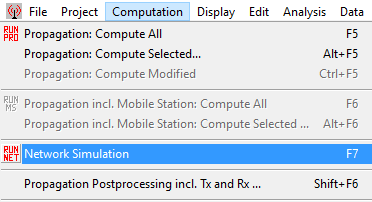 A network-planning analysis starts with a regular propagation analysis, launched through the RUN PRO button or the Computation menu. This provides results like received power over the area of interest. The network-planning post-processing is launched through the RUN NET button or the Computation menu.