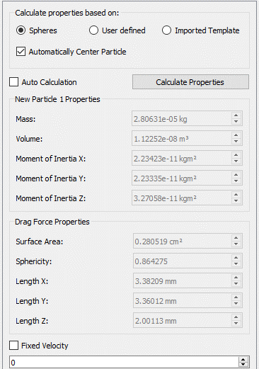 2. Click Calculate Properties to calculate the mass, volume, and moments of inertia for the current particle.