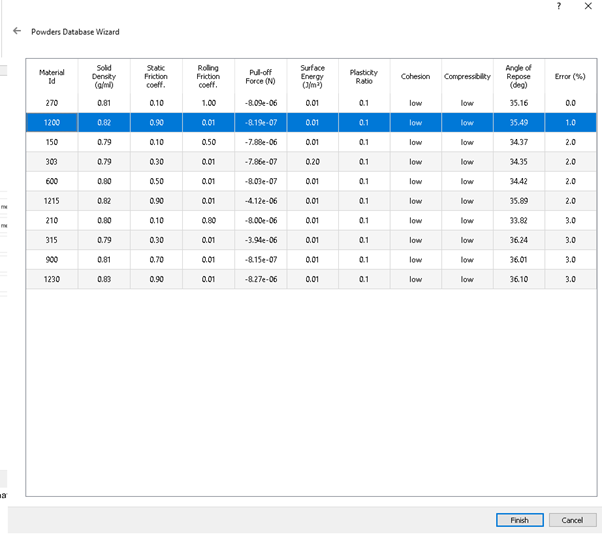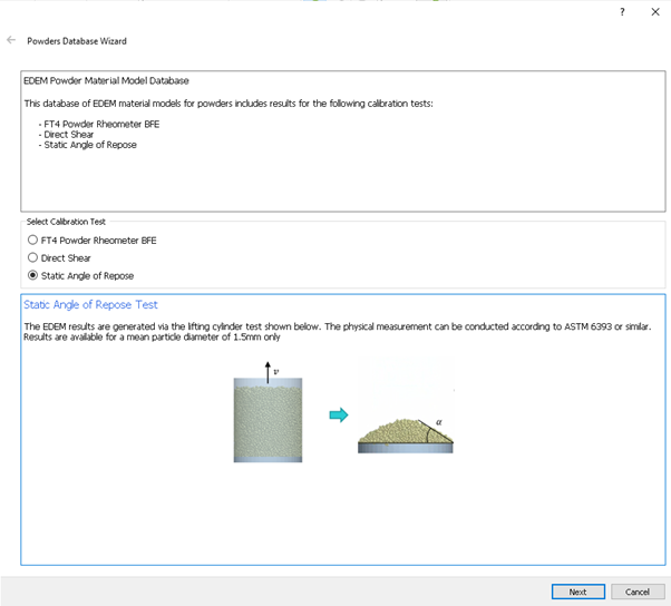 The EDEM Powders database is a collection of EDEM material models for powders that includes the static angle of repose and the steady state Shear Stress responses.