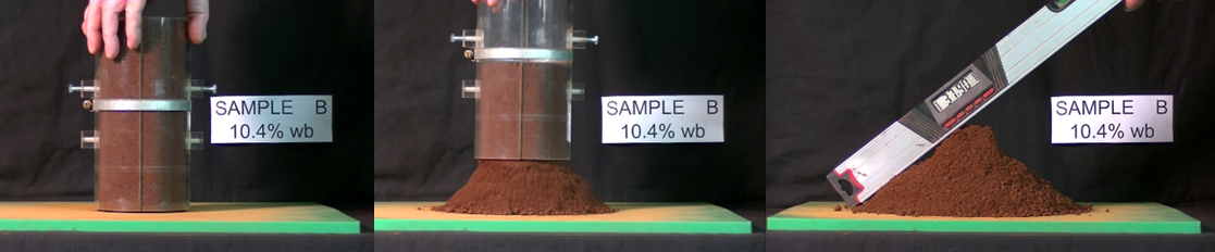 A sample of the Bulk Material is placed on a flat plate, which is subsequently inclined until the material slides. A low Bulk Material Angle of Repose will slide at a lower inclination angle than a high Bulk Material Angle of Repose. As a result, the Bulk Material is classified as Low Angle (less than 35 degrees), Medium Angle (more than 35 degrees but less than 45 degrees), and High Angle (greater than 45 degrees).