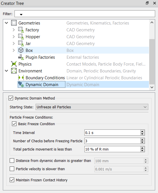 Distance from dynamic domain is greater than Indicates that particles will be frozen as soon as they reach a certain distance away from the Dynamic Domain boundaries.
