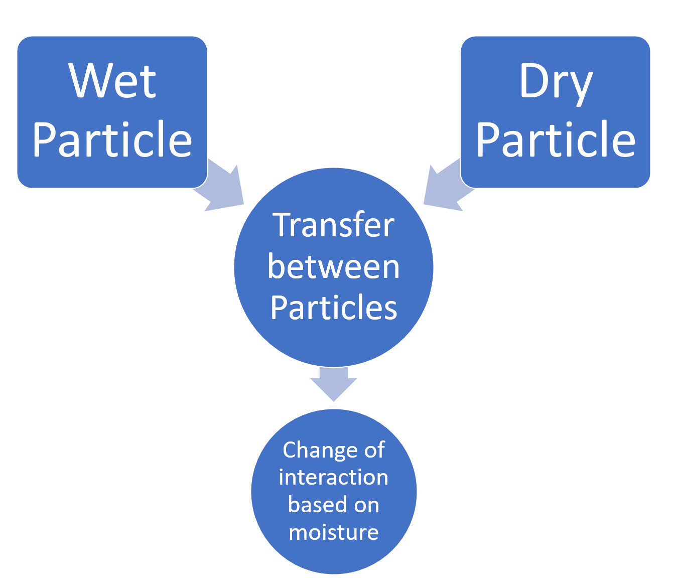 This model is aimed at cement applications as the moisture can be transferred to drier particles while mixing. The level of moisture in the model alters the interaction behavior of the particles.