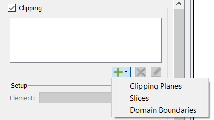 Note: You can define the planes, slices, or boundaries in the lower half of the Clipping Elements section.The top half of this section contains the list used to determine which elements within your model are affected by the clipping group. For example, you may want to only clip the geometries and leave the particles intact. By default, all the elements are included in the group. The elements are categorized by type - particles, geometry, and contacts.