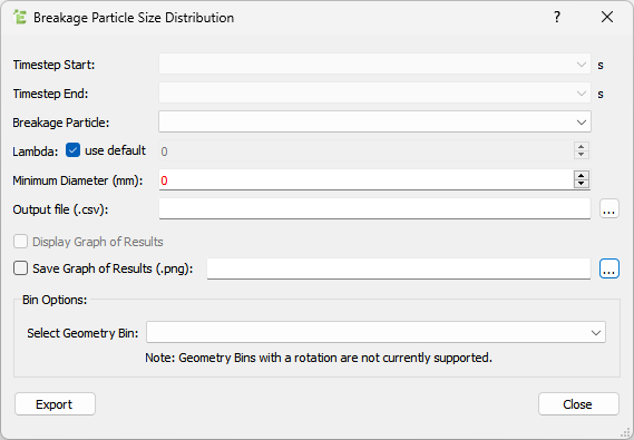For Specify Timestep: Specify the Time Step at which breakage should be analyzed. Breakage Particle Select the particles that may break from the dropdown list. Lambda: use default Specify the material parameter involved in the distribution of fines. EDEM provides an automatic estimate based on other material parameters, see Tavares and Changas 2020 in Bibliography and References. Minimum Diameter (mm): Specify the minimum diameter in the generated PSD plot. This diameter must be smaller than the size of the smallest particle in the simulation, because the PSD in the plot reconstructs sizes lower than the smallest simulated particles. Output file (csv): Navigate to the location to which the ,csv file should be saved. Display Graph of Results Select the checkbox to plot a graph of the Particle Size Distribution. Save Graph of Results (png): Click to save the graph of the Particle Size Distribution. Bin Options: Select Geometry Bin: Select Geometry bins without rotation. Geometry bins with rotation are not supported. - Click Export to export the breakage particle size distribution data.