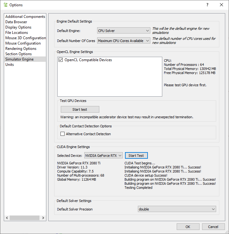 Note: The test is a standard hardware test for GPU. If the test fails, ensure that your Graphics Card drivers are up to date and try again or contact Technical Support with details of the GPU device used. - Select the GPU from the Selected Engine dropdown list once the test has run successfully.