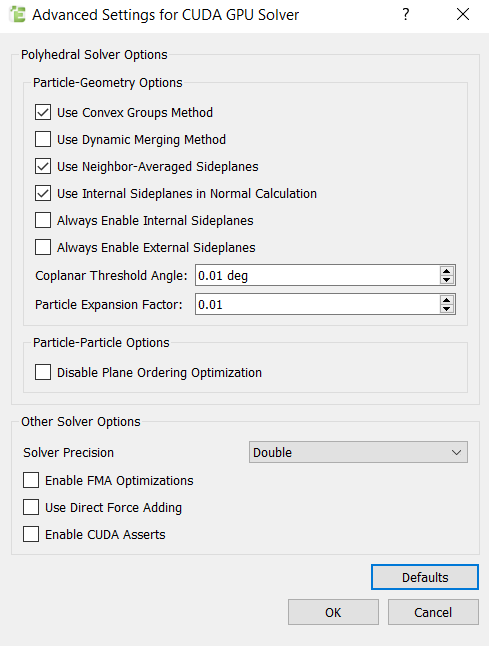 You can configure advanced settings within GPU specific to the CUDA solver. These settings allow the customization of Particle-Geometry and Particle-Particle overlap calculations.