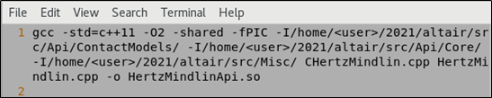 HertzMindlinAPI.so, use the following command:g++ -std=c++11 -O2 -shared -fPIC -I/home/<user>/<version number>/altair/src/Api/ContactModels/ -I/home/<user>/<version number>/altair/src/Api/Core/ -I/home/<user>/<version number>/altair/src/Misc/ CHertzMindlin.cpp HertzMindlin.cpp -o HertzMindlinAPI.so - If you modify the installation path during the installation, you must update