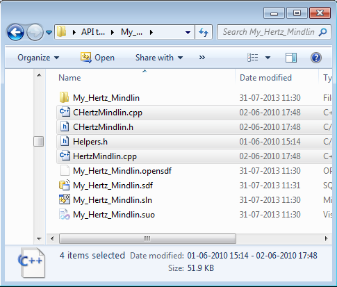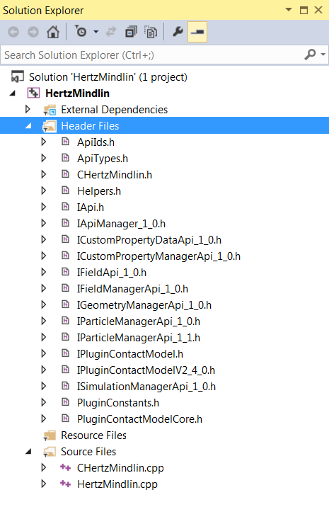 .cppand.hfiles to the newly created project folder.Note: EDEM header files are also required before the model for compilation. The additional header files are available at the following location: . - Copy the following files from Core and Contact Models to your Project