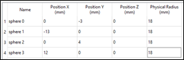 Physical Radius of the sphere from 0 to 18 mm and the Position X, Y, Z