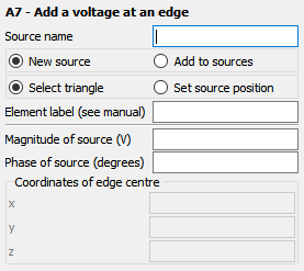 - If this item is selected, a triangle with label specified in the Element label (see manual) text box is searched for. The excitation is placed on the edge positioned opposite the first corner of the triangle. The label must be unique (if possible only one triangle must have this label). If there is more than one triangle with this label then only a single triangle will be fed. Alternatively, when selecting the option, Set source position, the feeding edge is determined by specifying its Cartesian coordinates in the Coordinates of edge centre group. These coordinates are in meters and optionally scaled by the SF card. The edge must be positioned between two triangles or between a triangle and a ground plane or UTD plate.