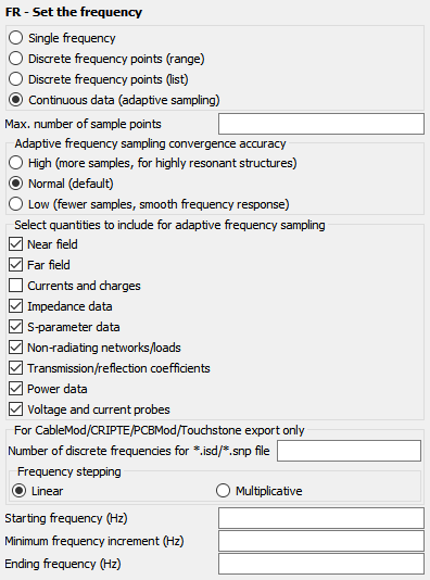 The solution can be done for a single frequency, a range of discrete frequencies (linear or multiplicative stepping), a list of discrete frequencies or a continuous solution in a given frequency band with adaptive frequency interpolation with the option to set the convergence accuracy. For a continuous solution, only one FR card is allowed. Specific quantities of interest to the user may also be selected to be included for adaptive sampling. Unselected quantities will be calculated at the discrete solution frequency points.
