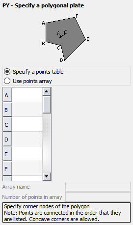 A maximum of 26 corner points are allowed using the table entry method, but there is no restriction on the number of points using the array entry method. The points are connected in the order that they are entered in the PY card. The corner points have to be defined prior to the PY card by a DP card.