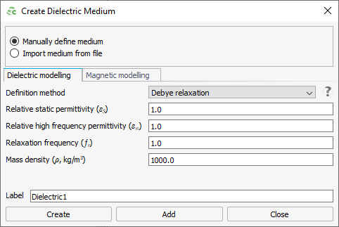 Figure 1. The Create Dielectric Medium dialog (Debye relaxation).