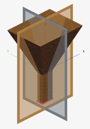 Figure 2. Example of a horn antenna with magnetic symmetry (in grey) defined at the X=0 plane and electric symmetry (in brown) defined at the Y=0 plane.