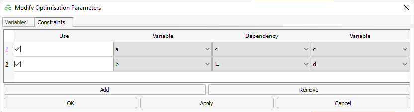 A constraint is defined by specifying two parameters and their dependency on one another, see Figure 1. The following dependencies are available: !=, <, <=, > and >=.