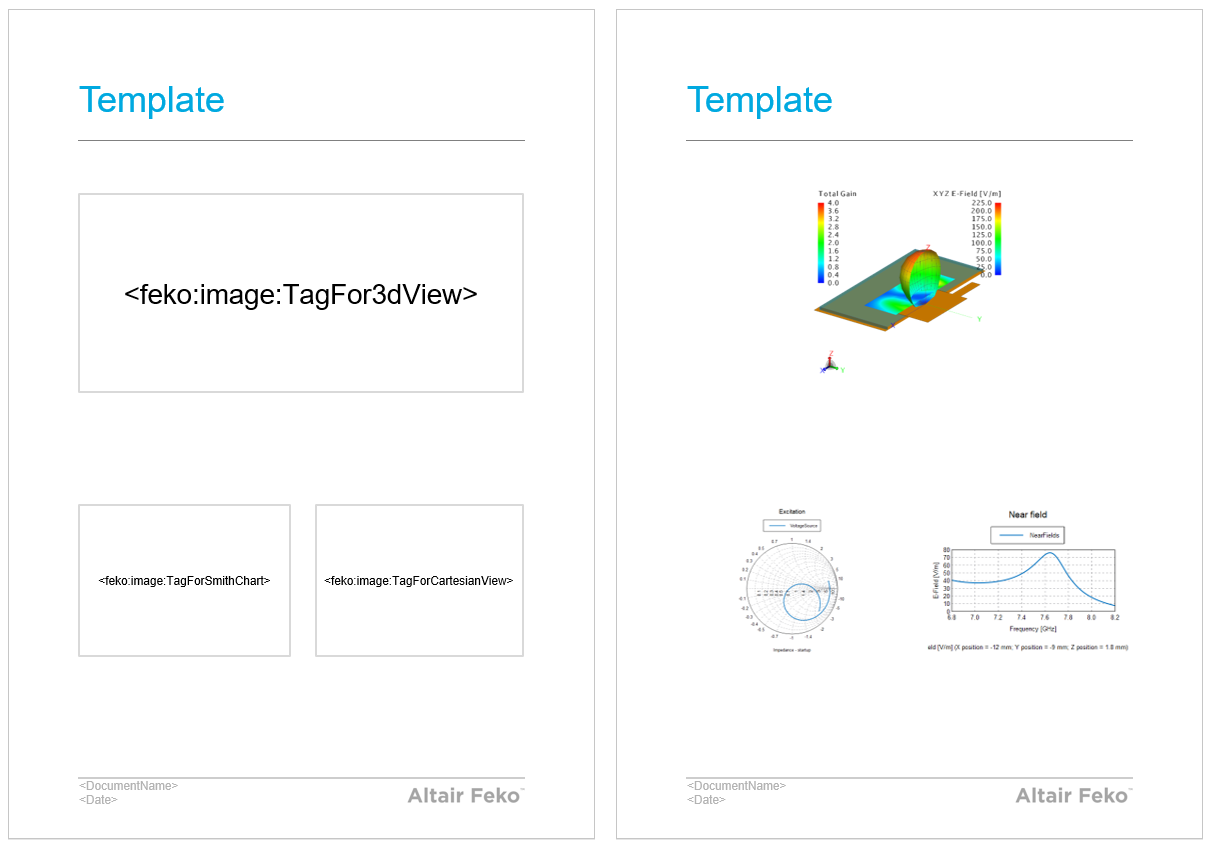 at the positions in the template where the 3D view and graphs will be required and (b) the report that will be generated when using this template.