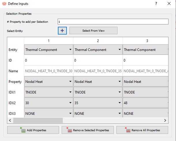 Use the Select Entity or Add Properties menu to add entities.- Click Select from View to select objects from the Flow Simulator model window. Select objects until the Select from View icon is clicked again, or the Define Inputs or Define Outputs window is closed.