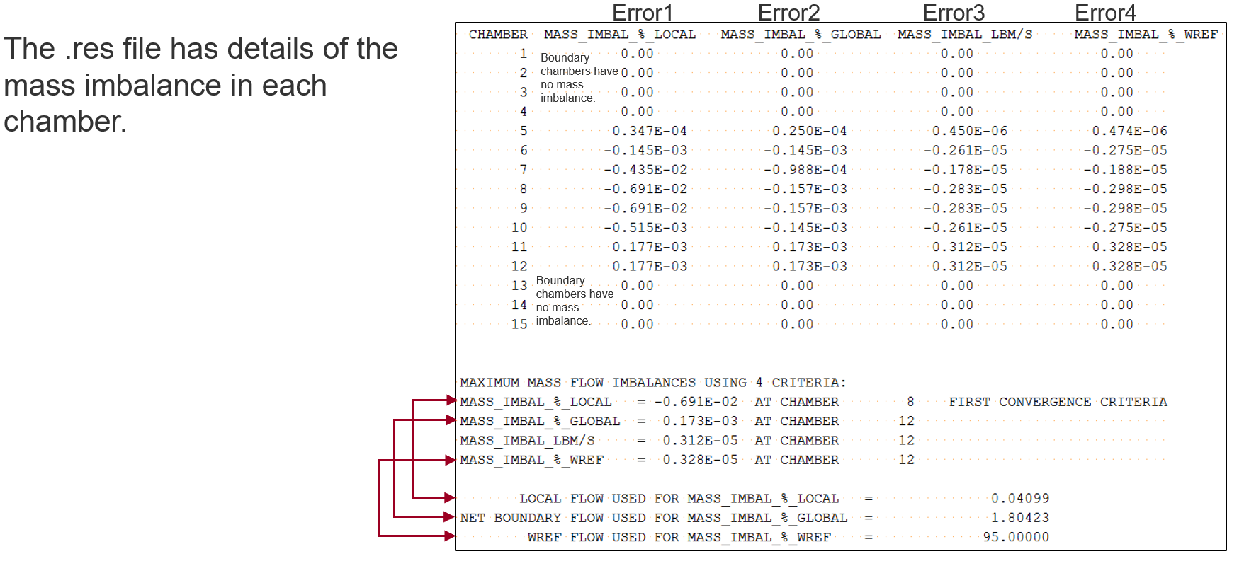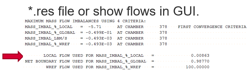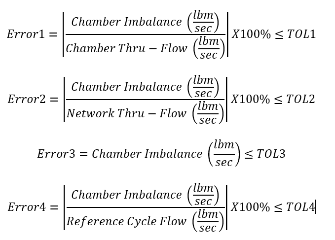 The 4 different mass continuity options differ in the value that’s used in the denominator of the error equation. Error1 can be the most severe since the Error can be large if the chamber thru-flow is very low even if the imbalance is low in terms of lbm/sec. User can use the option they feel gives them accurate results and good run time.
