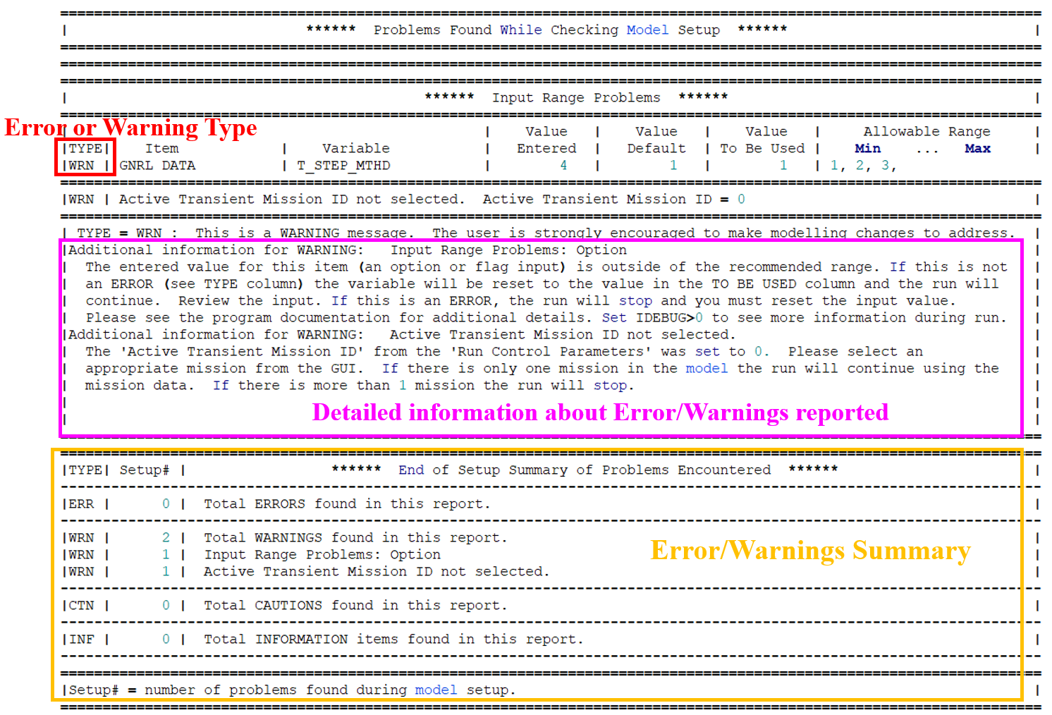 The ‘convhist_fi.out’ file contains error and warning messages that occur during the model read operation and during the first and the final iterations of the run. It is intended to enable the user to debug errors in the model and to diagnose other problems that may occur. There errors & warnings are categorized into four types. They are
