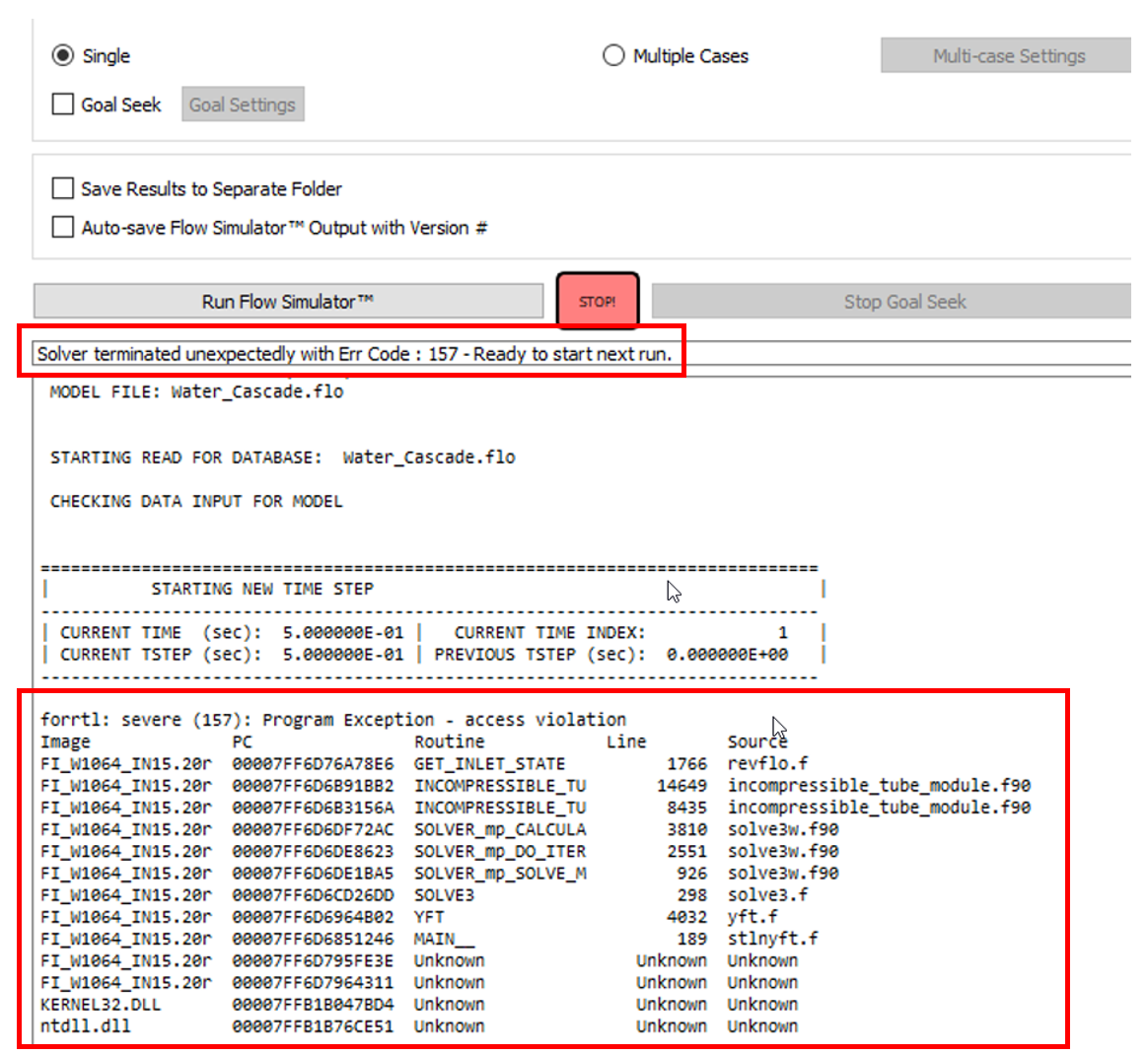 During solver iteration, if the solver stops due to runtime errors, the trace back gets printed on the output window with error codes. You can check the details of run time Fortran error codes from here.