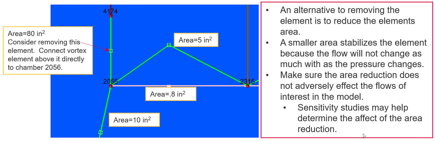 Check element restriction areas around chambers that are not converging. If any elements have a much larger area than surrounding elements, consider removing the element. The element probably has a very small pressure drop and velocity (check the non-converged result). Removing it should have a minimal effect on results.