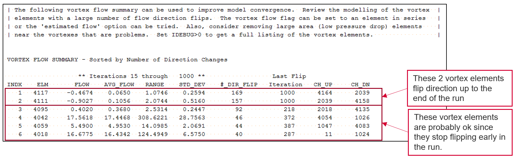 Often experimenting with the vortex element flow flag can help convergence of models. The “Estimated Flow” option can be helpful for vortex elements in troublesome parts of the model.