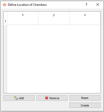 - Creates a chamber at the X,Y,Z locations in the table. A table of X,Y,Z coordinates can be copied and pasted into this table from another program (such as a spreadsheet editor).