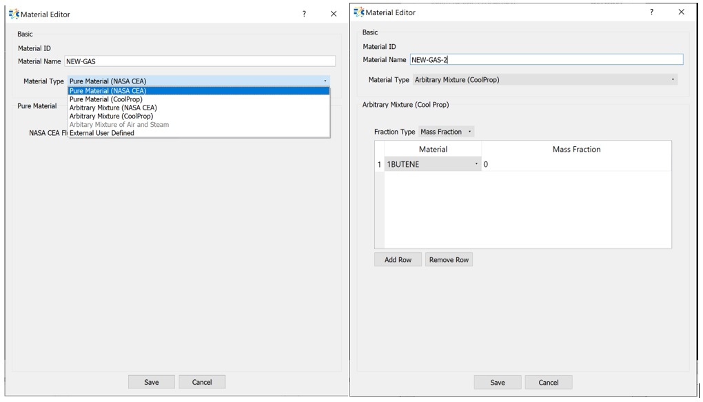 Select one of these materials, and all fluid and thermal properties (density, viscosity, specific heat, conductivity, and so on) are used from the NASA CEA database or from the CoolProp database, based on your selection.