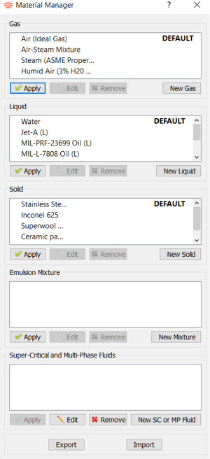 In Flow Simulator, use the Material Manager option to define a default material for models, either by selecting from the predefined lists or by creating materials. This eliminates the need to select a material through the Property Editor.