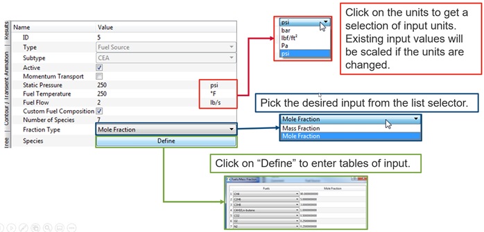 The property editor Allows the user to modify the input to all types of Flow Simulator entities: Elements, chambers, resistors, nodes and components. By default, the items shown are the most important and maybe all that you need to change. Pay close attention to the blue text. These items must have user inputs. Items under “Show More” and “Advanced Options” contain inputs that are not used as often.