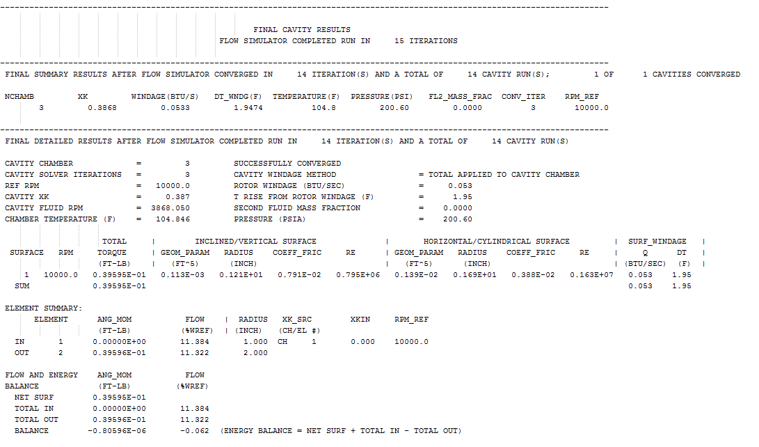 Cav.out file contains cavity output data consisting of temperatures, pressures, swirl, windage, and attached element information. This is only written if the model contains cavities and the user has chosen to write the file. It is useful for verifying the results of the cavities.