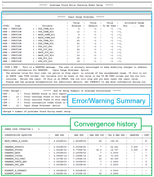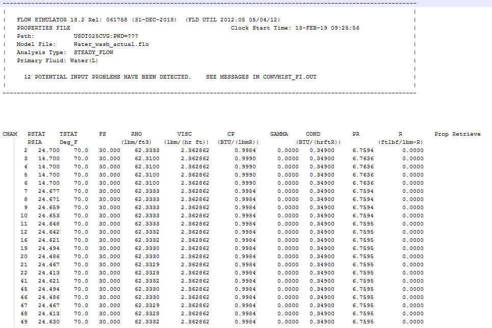 The convhist_fi.out’ file contains error and warning messages that occur during the model read operation and during the first and the final iterations of the run. It is intended to enable the user to debug errors in the model and to diagnose other problems that may occur. The “CONV” column indicates the variable was converged “Y” or not converged “N” for this flow iteration. This file is very important to check for modeling problems or solver convergence problems.