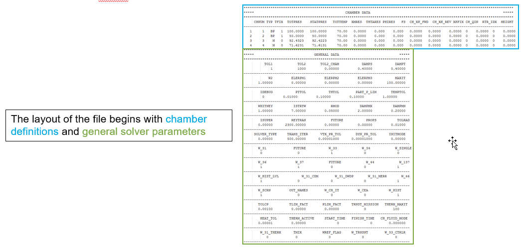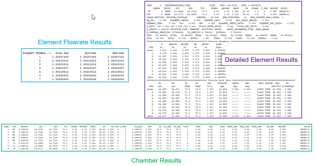 The principal output file, the ‘.res’ file, contains solution results for chamber pressures, temperatures, fluid fractions, and velocities as well as element flows and detailed element internal variables. The .res file is read by the GUI for post processing of results. The user can also review this file in a text editor to see details of the element results.